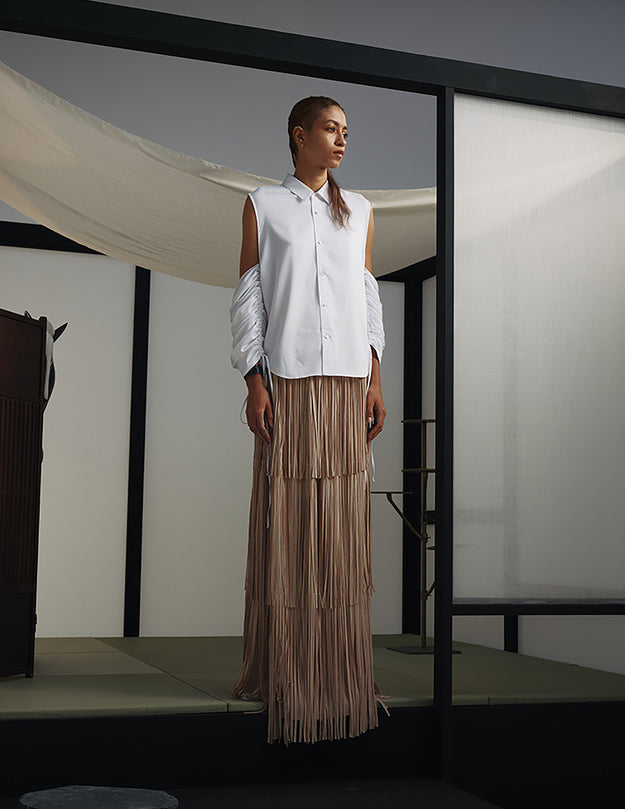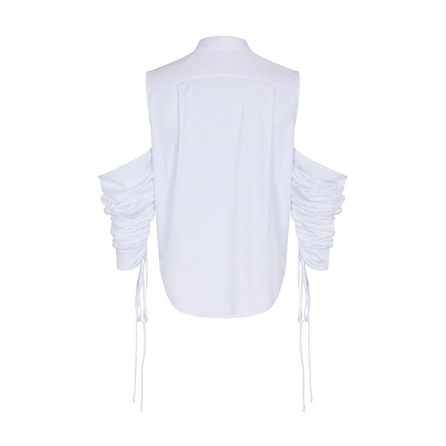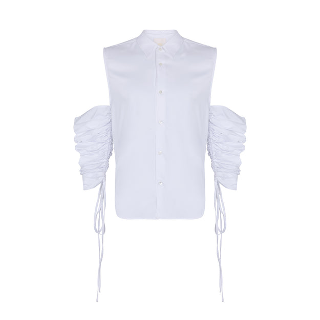 A primitive-style shirt featuring built-in drawcords in the sleeves, allowing for versatile styling and a customizable silhouette. This piece is crafted from a high-quality, silk-like cotton fabric that offers a luxurious feel and elegant drape. The cut-off details on the shoulders add a deconstructed, avant-garde edge to this unique design.