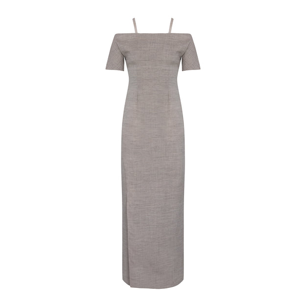 A modern yet primitive one-piece dress that showcases innovative use of materials. This piece is crafted from hair canvas, a material typically used for the internal structure of tailored jackets, to create a unique texture and form. The result is a dress with a structured yet elegant silhouette, embodying the brand's deconstructive and conceptual design philosophy.