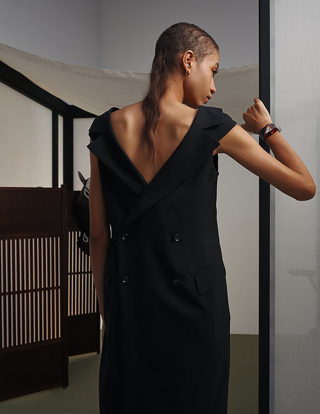 A key piece from AYA DESIGN's SS26 'L'île déserte' collection, presented at London Fashion Week. This dress uniquely reconstructs a tailored jacket, reversing its structure to create a powerful and elegant silhouette. The design embodies the brand's core concepts of deconstruction and reconstruction, offering a piece that is both genderless and ageless.