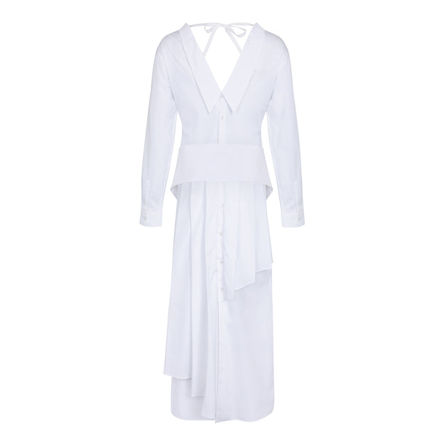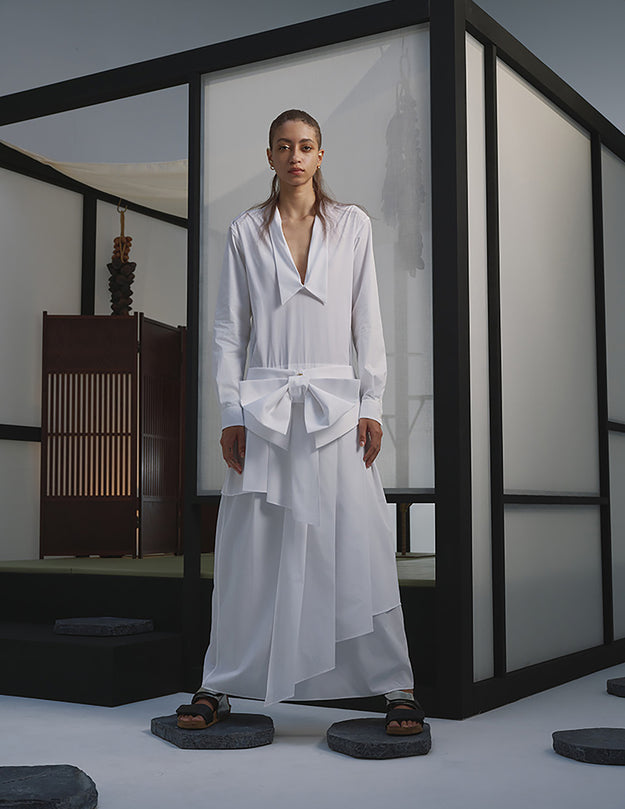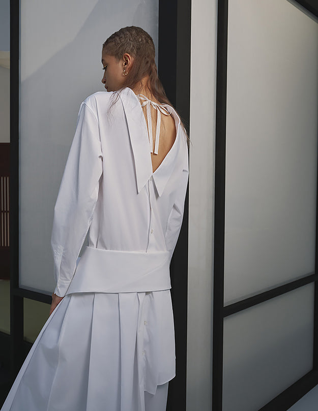 A modern yet primitive one-piece dress that showcases innovative use of materials. This piece is crafted from hair canvas, a material typically used for the internal structure of tailored jackets, to create a unique texture and form. The result is a dress with a structured yet elegant silhouette, embodying the brand's deconstructive and conceptual design philosophy.
