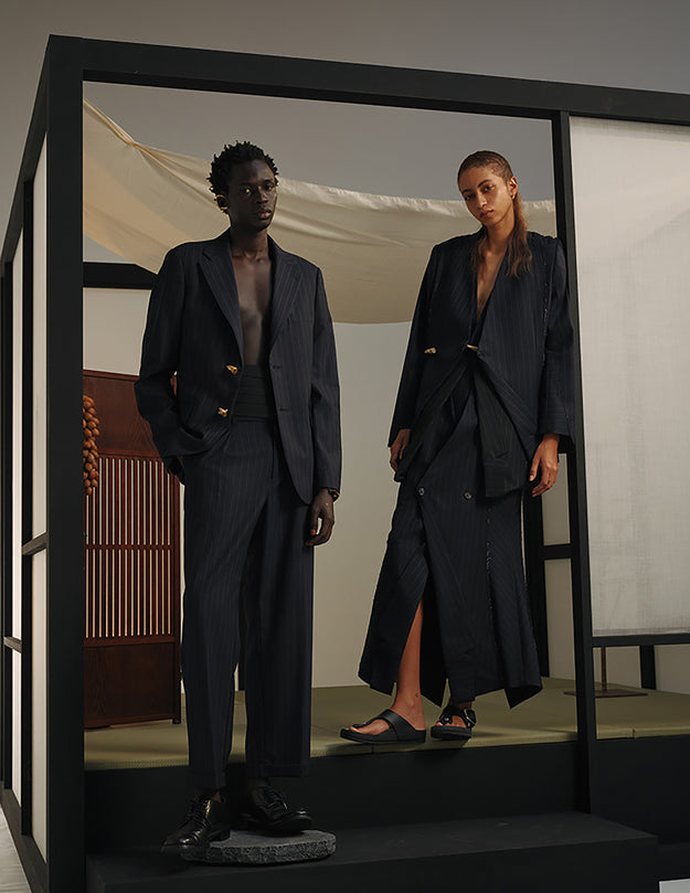 A single-breasted striped tailored jacket that embodies a primitive yet refined aesthetic. It is crafted from a high-performance suit fabric developed in Japan, which provides superior strength, flexibility, and a luxurious feel. The sharp tailoring and classic pinstripe pattern make it a timeless and versatile piece.
